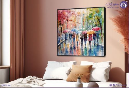 تابلوه حائط مجموعة من الاشخاص مع مظلات, مجموعة من الأشخاص يسيرون في شارع تحت المطر حاملين مظلات ملونة، الأشجار المحيطة بهم تتلون بألوان الخريف الزاهية مثل الأحمر والبرتقالي والأخضر، الأرضية مبللة وتعكس الألوان الجميلة من المظلات والأشجار، الأسلوب الفني المستخدم هو الرسم بالألوان المائية حيث تظهر الألوان متداخلة وممزوجة بشكل ناعم مما يعطي اللوحة إحساساً بالحركة والحيوية والجو الماطر، ويعكس جمال الطبيعة وتنوع الألوان في مشهد حضري, متوفر بمقاسات متعددة يمكنك اختيار او تغيير المقاس عند الطلب ,بتصميم مميز لـ تابلوهات مودرن, تابلوهات مودرن , لوحات فنية مودرن اشجار, شمسية و مظلات, شخصيات و وجوه, طبيعه صامتة, مناظر طبيعية , التابلوه يغلب عليه الالوان احمر - نبيتى, اخضر - زيتى, ازرق - تركواز, متعدد الالوان , و مصمم بالشكل التالى , اكريليك, ببرواز, برواز اسود, مربع , مناسب لديكور حوائط غرفة النوم, غرفة بنات , و هو يتميز بالسمات التالية : الوان مائية, تماثل - سيميترى, لوحات فنية, مودرن , متوفر الان فى مصر و يأتى جاهز للتركيب مع دليل التركيب و اكسسوارات التركيب اللازمه