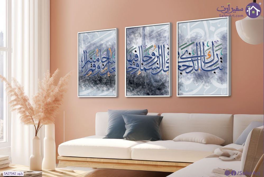 كلنا بنتبارك بالأيات القرآية وبنبقى حريصين إنها تنور بيوتنا لوحة مودرن لللآية القرآينة الكريمة تَبَارَكَ الَّذِي جَعَلَ فِي السَّمَاءِ بُرُوجًا وَجَعَلَ فِيهَا سِرَاجًا وَقَمَرًا مُّنِيرًا من سورة الفرقان بكتابة إسلامية على خلفية بنقوش إسلامية, متوفر بمقاسات متعددة يمكنك اختيار او تغيير المقاس عند الطلب ,بتصميم مميز لـ تابلوهات مودرن, تابلوهات مودرن , لوحات فنية مودرن اسلامى - ايات قرآنية و خط عربى, ايات قرآنية و خط عربى , التابلوه يغلب عليه الالوان ازرق - تركواز, رمادى , و مصمم بالشكل التالى 3 قطع, متعدد القطع ( اى عدد ) , بالعرض, ببرواز, برواز ابيض, مستطيل , مناسب لديكور حوائط غرفة الاستقبال, غرفة المعيشة, مدخل المنزل, مكاتب – شركات - اعمال , و هو يتميز بالسمات التالية : ديجيتال آرت, قابل للتعديل, كتابات و حروف, مودرن , متوفر الان فى مصر و يأتى جاهز للتركيب مع دليل التركيب و اكسسوارات التركيب اللازمه