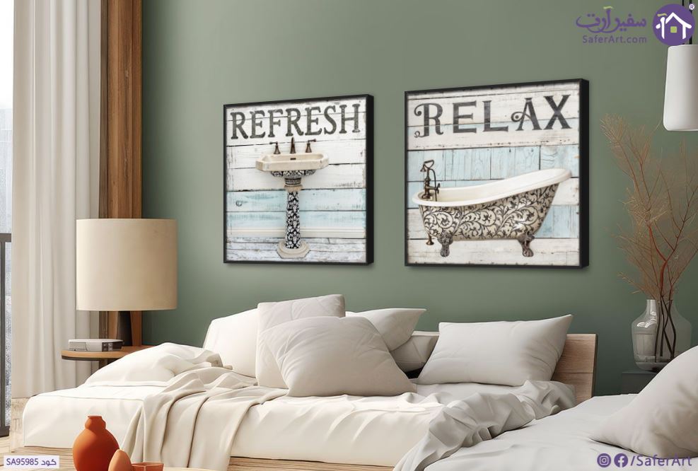 مجموعة لوحات ديكور مكونة من قطعتين بتصميم عتيق يجمع بين الاناقة والبساطة حيث تعرض حوض وبانيو كلاسيكيين مزخرفين بنقوشات فنية جميلة على خلفية خشبية بالوان هادئة مع كلمتي استرخاء وانتعاش لاضافة لمسة فنية فريدة ومميزة لديكور الحمام والمساعدة على الشعور بالراحة والهدوء مما يجعلها اختيار مثالي لتزيين جدران الحمامات او غرف الغسيل., متوفر بمقاسات متعددة يمكنك اختيار او تغيير المقاس عند الطلب ,بتصميم مميز لـ تابلوهات مودرن, تابلوهات مودرن , لوحات فنية مودرن English Text & Quotes, تويليت - غسيل , التابلوه يغلب عليه الالوان ابيض - اوف وايت, ابيض و اسود, ازرق - تركواز, اسود , و مصمم بالشكل التالى 2 قطعه, متعدد القطع ( اى عدد ) , بالعرض, ببرواز, برواز اسود, مستطيل , مناسب لديكور حوائط غرفه الغسيل - التويليت , و هو يتميز بالسمات التالية : بسيط و هادئ, ديجيتال آرت, عتيق - فينتاج, كتابات و حروف, كلاسيك – نيو كلاسيك, مودرن , متوفر الان فى مصر و يأتى جاهز للتركيب مع دليل التركيب و اكسسوارات التركيب اللازمه