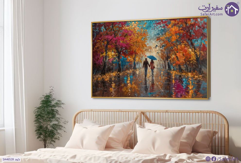 لوحة فنية رومانسية لرجل وامرأة يحملان مظلة ويسيران في طريق ممتد بين أشجار الغابة مع إنعكاس أضواء الشارع بألوان زاهية مبهجة وحالمة., متوفر بمقاسات متعددة يمكنك اختيار او تغيير المقاس عند الطلب ,بتصميم مميز لـ تابلوهات مودرن, تابلوهات مودرن , لوحات فنية مودرن رومانسى - ثنائى, رومانسى, شخصيات و وجوه , التابلوه يغلب عليه الالوان احمر - نبيتى, ازرق - تركواز, برتقالى , و مصمم بالشكل التالى 1 قطعه , بالعرض, ببرواز, برواز ذهبى, مستطيل , مناسب لديكور حوائط غرفة الاستقبال, غرفة المعيشة, غرفة النوم , و هو يتميز بالسمات التالية : الوان زيتية - اكريليك, لوحات فنية, مودرن , متوفر الان فى مصر و يأتى جاهز للتركيب مع دليل التركيب و اكسسوارات التركيب اللازمه