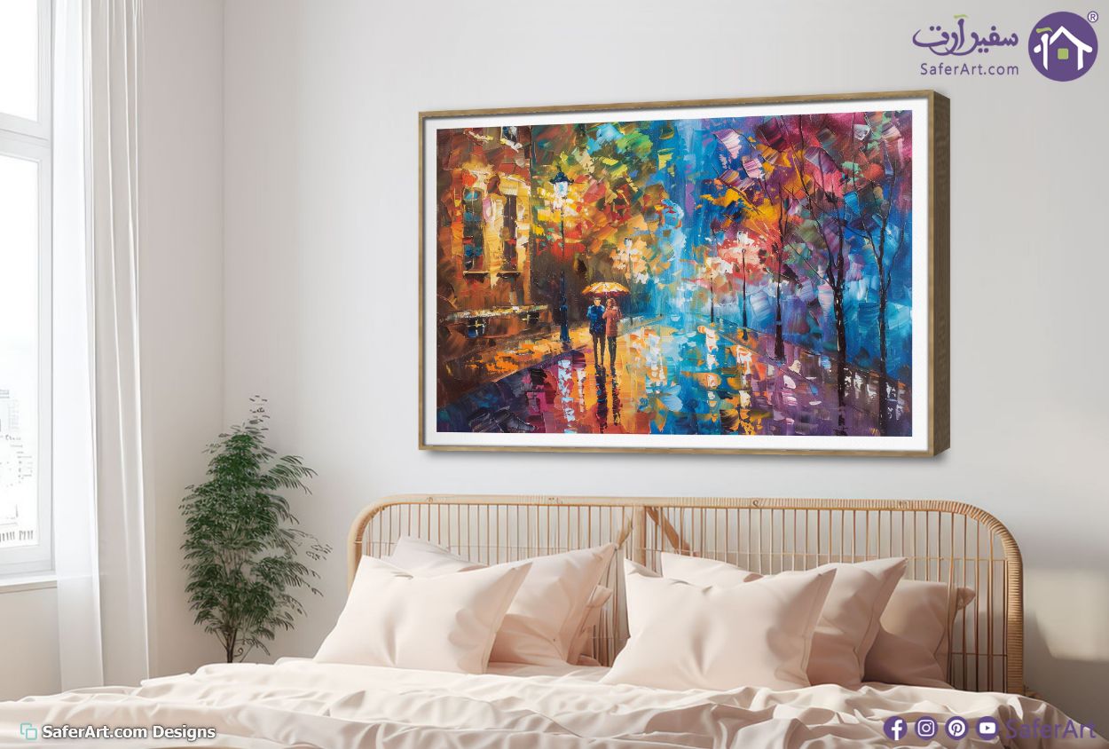 تعد هذه اللوحة من ارقى لوحات حائط مودرن التي تجسد مشهد رومانسي لشخصين يسيران تحت المظلة في شارع مدينة هادئ وقت هطول الامطار حيث تم استخدام اسلوب السكين الفني بضربات الوان زيتية بارزة وسميكة تبرز تباين الاضواء الذهبية للمصابيح مع انعكاسات الشارع المبلل والاشجار الملونة مما يضفي احساسا بالدفء والجمالية الفنية المعاصرة داخل المكان, متوفر بمقاسات متعددة يمكنك اختيار او تغيير المقاس عند الطلب ,بتصميم مميز لـ تابلوهات مودرن, تابلوهات مودرن , لوحات فنية مودرن اشجار, اوراق شجر - نباتات, رومانسى - ثنائى, مبانى و هندسة معمارية, شخصيات و وجوه, اماكن و مدن و مباني, مناظر طبيعية, ورود - زهور - نباتات , التابلوه يغلب عليه الالوان ابيض - اوف وايت, ازرق - تركواز, اصفر, برتقالى, قوى و زاهى, متعدد الالوان , و مصمم بالشكل التالى 1 قطعه , بالعرض, ببرواز, برواز ذهبى, مستطيل , مناسب لديكور حوائط غرفة الاستقبال, غرفة المعيشة, غرفة النوم, مدخل المنزل, مكاتب – شركات - اعمال , و هو يتميز بالسمات التالية : الوان زيتية - اكريليك, لوحات فنية, مظهر بارز, مودرن , متوفر الان فى مصر و يأتى جاهز للتركيب مع دليل التركيب و اكسسوارات التركيب اللازمه