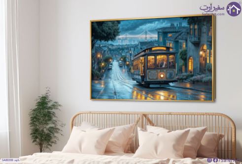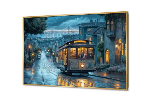 تابلوه مودرن كانفس ترام مدينه سان فرانسيسكو ليلا, مشهدًا ليليًا لمدينة سان فرانسيسكو مع التركيز على الترام الكهربائي الشهير الذي يسير على طول شارع مُنحدر، مُنفّذًا بأسلوب الرسم الرقمي الذي يجمع بين الواقعية والتعبير الفني، مع إبراز الأجواء الليلية والانعكاسات الضوئية على الأسطح الرطبة، وإضافة لمسة درامية من خلال السماء الملبدة بالغيوم., متوفر بمقاسات متعددة يمكنك اختيار او تغيير المقاس عند الطلب ,بتصميم مميز لـ تابلوهات مودرن, تابلوهات مودرن , لوحات فنية مودرن اماكن و مدن و مباني, دول و مدن مشهورة, سيارات – دراجات - مواصلات, قطارات , التابلوه يغلب عليه الالوان ازرق - تركواز, اصفر , و مصمم بالشكل التالى 1 قطعه , بالعرض, ببرواز, برواز ذهبى, مستطيل , مناسب لديكور حوائط غرفة الاستقبال, غرفة المعيشة, غرفة النوم, مكاتب – شركات - اعمال , و هو يتميز بالسمات التالية : الوان زيتية - اكريليك, كلاسيك – نيو كلاسيك, لوحات فنية, مودرن , متوفر الان فى مصر و يأتى جاهز للتركيب مع دليل التركيب و اكسسوارات التركيب اللازمه