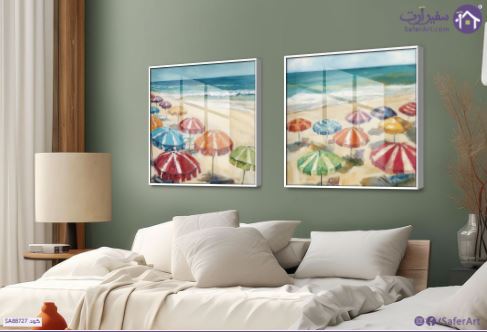 تابلوهات حائط شاطئ بحر مزدحم بالشمسيات الملونة, مشهدين متجاورين لشاطئ بحر مزدحم بالمظلات الملونة بألوان متنوعة كالأزرق والأحمر والبرتقالي والأخضر والبنفسجي مع شاطئ رملي بيج فاتح وبحر أزرق متموج وبعض الكراسي الشاطئية، مُنفذًا بأسلوب الرسم الانطباعي الذي يُركز على التقاط الانطباع اللحظي للمشهد باستخدام ضربات فرشاة سريعة وواضحة وألوان زاهية تُظهر تأثير الضوء وأوقات النهار المختلفة واستخدام المنظور لإعطاء إحساس بالعمق واتساع المشهد، ما يُعزز الإحساس بالحيوية والبهجة والاستمتاع بأجواء الصيف ويُوحي بفكرة العطلة والاسترخاء على شاطئ البحر., متوفر بمقاسات متعددة يمكنك اختيار او تغيير المقاس عند الطلب ,بتصميم مميز لـ تابلوهات مودرن, تابلوهات مودرن , لوحات فنية مودرن شاطئ البحر, شمسية و مظلات, بحار و شواطئ و مراكب, طبيعه صامتة , التابلوه يغلب عليه الالوان ازرق - تركواز, اصفر, متعدد الالوان, موف – ارجوانى , و مصمم بالشكل التالى 2 قطعه, متعدد القطع ( اى عدد ) , اكريليك, بالعرض, ببرواز, برواز ابيض, مستطيل , مناسب لديكور حوائط غرفة الاستقبال, غرفة المعيشة, مكاتب – شركات - اعمال , و هو يتميز بالسمات التالية : الوان زيتية - اكريليك, دول البحر المتوسط, لوحات فنية, مودرن , متوفر الان فى مصر و يأتى جاهز للتركيب مع دليل التركيب و اكسسوارات التركيب اللازمه