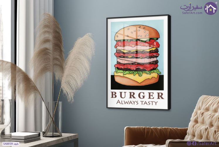 تابلوه حائط البرجر الشهى, تهتم اللوحة بالتفاصيل الدقيقة, بألوان زاهية وجذابة, الخلفية بسيطة باللون الأزرق الفاتح، مما يركز الانتباه على البرجر كعنصر رئيسي في اللوحة, يوجد أسفل الصورة كلمة "BURGER" بخط كبير وواضح، وتحتها عبارة "ALWAYS TASTY"., متوفر بمقاسات متعددة يمكنك اختيار او تغيير المقاس عند الطلب ,بتصميم مميز لـ تابلوهات مودرن, تابلوهات مودرن , لوحات فنية مودرن طعام - مأكولات, مشروبات – اطعمة - المطبخ , التابلوه يغلب عليه الالوان احمر - نبيتى, ازرق - تركواز, اصفر, بنى - بيج , و مصمم بالشكل التالى 1 قطعه , اكريليك, بالطول, ببرواز, برواز اسود, مستطيل , مناسب لديكور حوائط غرفة الطعام - المطبخ , و هو يتميز بالسمات التالية : الستريشن - فيكتور, كتابات و حروف, لوحات فنية, مودرن , متوفر الان فى مصر و يأتى جاهز للتركيب مع دليل التركيب و اكسسوارات التركيب اللازمه