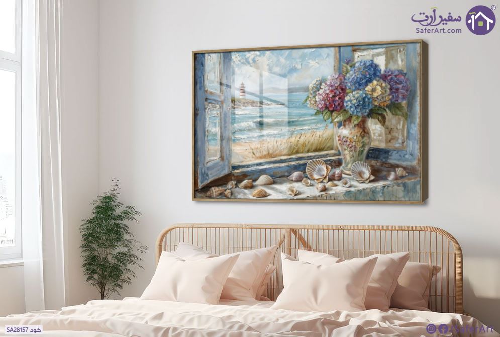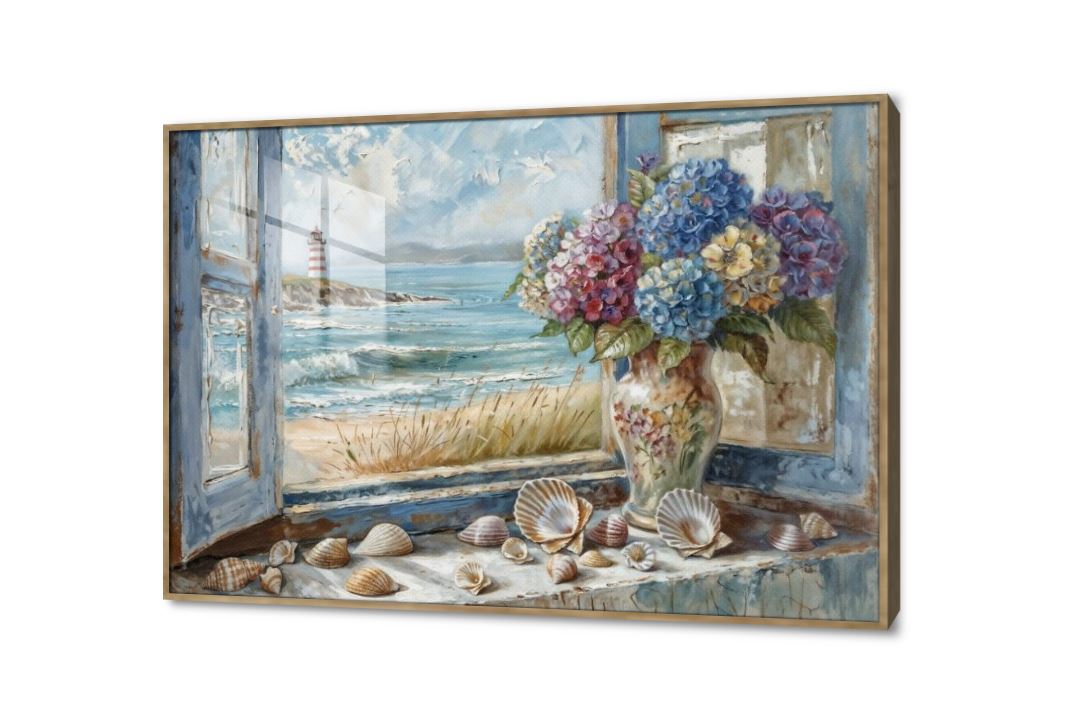لوحة فنية لمنظر طبيعي رائع للشاطئ  والبحر من نافذة منزل وفازة تحمل مجموعة من الورود بألوان مبهجة رقيقة., متوفر بمقاسات متعددة يمكنك اختيار او تغيير المقاس عند الطلب ,بتصميم مميز لـ تابلوهات مودرن, تابلوهات مودرن , لوحات فنية مودرن نوافذ, اماكن و مدن و مباني , التابلوه يغلب عليه الالوان ازرق - تركواز, رمادى , و مصمم بالشكل التالى 1 قطعه , اكريليك, بالعرض, ببرواز, برواز خشبى, مستطيل , مناسب لديكور حوائط غرفة الاستقبال, غرفة المعيشة, مدخل المنزل , و هو يتميز بالسمات التالية : الوان زيتية - اكريليك, دول البحر المتوسط, كلاسيك – نيو كلاسيك, لوحات فنية , متوفر الان فى مصر و يأتى جاهز للتركيب مع دليل التركيب و اكسسوارات التركيب اللازمه