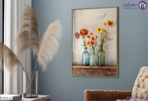 لوحات ديكور تصور باقة من الزهور البرية الملونة والمبهجة موضوعة بعناية داخل ثلاث زجاجات عتيقة على رف خشبي قديم بأسلوب فني يجمع بين الواقعية ولمسة من الطراز الريفي العتيق مما يضفي على المكان شعورا بالدفء والبساطة الطبيعية والجمال الهادئ الذي يعيد الحياة الى جدران منزلك ويمنحه لمسة فنية فريدة., متوفر بمقاسات متعددة يمكنك اختيار او تغيير المقاس عند الطلب ,بتصميم مميز لـ تابلوهات مودرن, تابلوهات مودرن , لوحات فنية مودرن طبيعه صامتة, فازات و اوانى, ورود - زهور - نباتات , التابلوه يغلب عليه الالوان ابيض - اوف وايت, ازرق - تركواز, اصفر, برتقالى , و مصمم بالشكل التالى 1 قطعه , بالطول, ببرواز, برواز خشبى, مستطيل , مناسب لديكور حوائط غرفة الاستقبال, غرفة المعيشة, غرفة النوم, غرفة بنات, مدخل المنزل, مكاتب – شركات - اعمال , و هو يتميز بالسمات التالية : بسيط و هادئ, صور فوتوغرافية, عتيق - فينتاج, مودرن , متوفر الان فى مصر و يأتى جاهز للتركيب مع دليل التركيب و اكسسوارات التركيب اللازمه