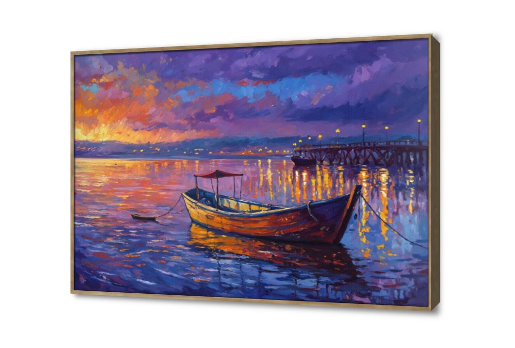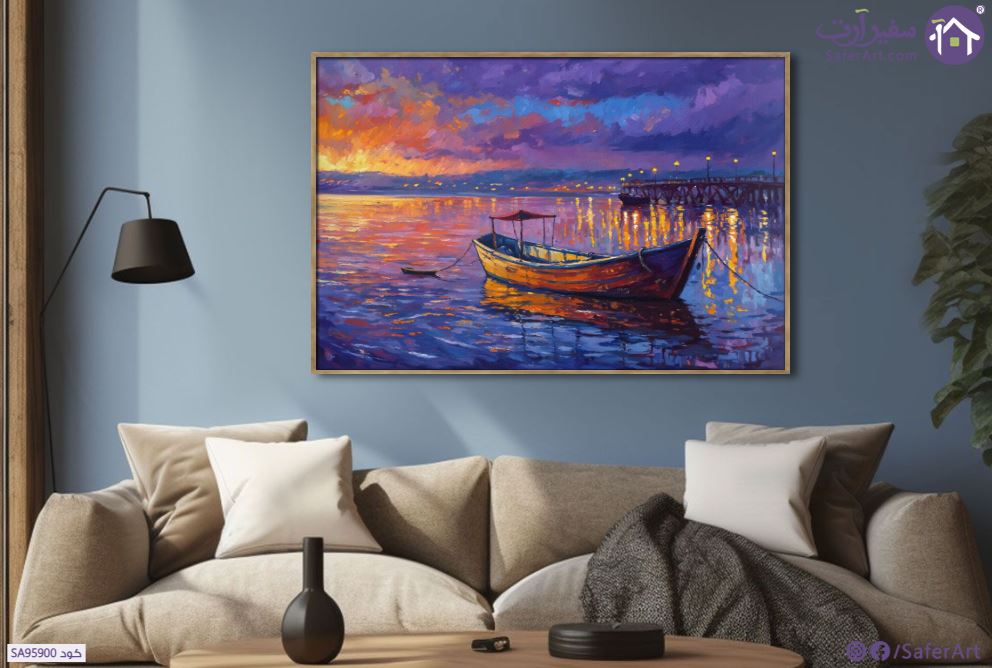 تابلوهات ديكور تجسد مشهد ساحر لقارب يرسو بهدوء على سطح الماء الذي يعكس الألوان الأرجوانية والبرتقالية للسماء عند الغروب وأضواء رصيف الميناء البعيد، مرسومة بأسلوب انطباعي يعتمد على ضربات الفرشاة الجريئة لإبراز جمال الضوء وانعكاساته الحيوية على المياه مما يمنح اللوحة إحساسا بالدفء والسكينة والهدوء., متوفر بمقاسات متعددة يمكنك اختيار او تغيير المقاس عند الطلب ,بتصميم مميز لـ تابلوهات مودرن, تابلوهات مودرن , لوحات فنية مودرن اعمال يدوية و اخرى, اماكن و مدن و مباني, بحار و شواطئ و مراكب, سحاب, شاطئ البحر, قوارب و مراكب, لوحات مدن على البحر, مناظر طبيعية , التابلوه يغلب عليه الالوان ازرق - تركواز, الوان داكنة, برتقالى, قوى و زاهى, متعدد الالوان, موف – ارجوانى , و مصمم بالشكل التالى 1 قطعه , بالعرض, ببرواز, برواز خشبى, مستطيل , مناسب لديكور حوائط غرفة الاستقبال, غرفة المعيشة, غرفة النوم, مدخل المنزل, مكاتب – شركات - اعمال , و هو يتميز بالسمات التالية : الوان زيتية - اكريليك, كلاسيك – نيو كلاسيك, لوحات فنية, مظهر بارز, مودرن , متوفر الان فى مصر و يأتى جاهز للتركيب مع دليل التركيب و اكسسوارات التركيب اللازمه