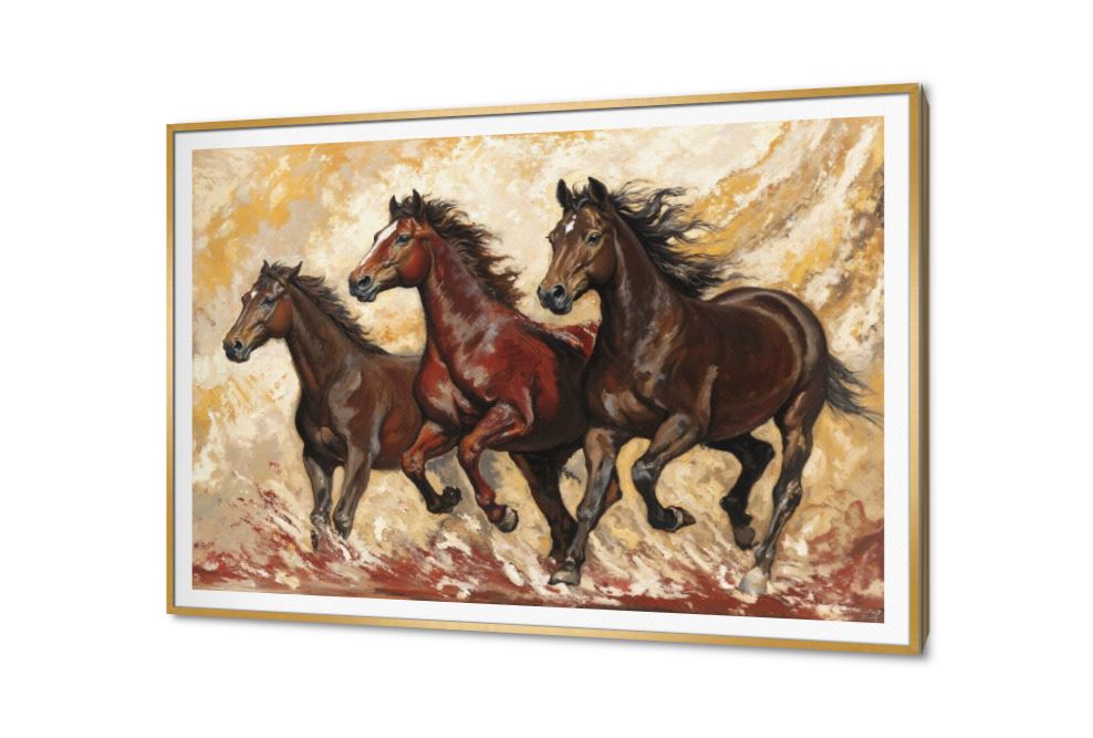 تجسد هذه اللوحة الفنية ثلاثة خيول تعدو بقوة وحيوية في منظر طبيعي تجريدي، حيث يبرز جمال التصميم في الأسلوب الفني الانطباعي الذي يستخدم ضربات الفرشاة الجريئة والألوان الدافئة مثل البني والأصفر والأحمر لتعكس إحساسا بالحركة والطاقة، مما يجعلها من أفضل لوحات حائط تضفي لمسة من الفخامة على أي ديكور., متوفر بمقاسات متعددة يمكنك اختيار او تغيير المقاس عند الطلب ,بتصميم مميز لـ تابلوهات مودرن, تابلوهات مودرن , لوحات فنية مودرن احصنه, حيوانات المزرعة, حيوانات و طيور, مناظر طبيعية , التابلوه يغلب عليه الالوان اصفر, بنى - بيج , و مصمم بالشكل التالى 1 قطعه , بالعرض, ببرواز, برواز SF9, برواز ذهبى, مستطيل , مناسب لديكور حوائط غرفة الاستقبال, غرفة المعيشة, غرفة النوم, مدخل المنزل, مكاتب – شركات - اعمال , و هو يتميز بالسمات التالية : الوان زيتية - اكريليك, كلاسيك – نيو كلاسيك, لوحات فنية, مظهر بارز, مودرن , متوفر الان فى مصر و يأتى جاهز للتركيب مع دليل التركيب و اكسسوارات التركيب اللازمه