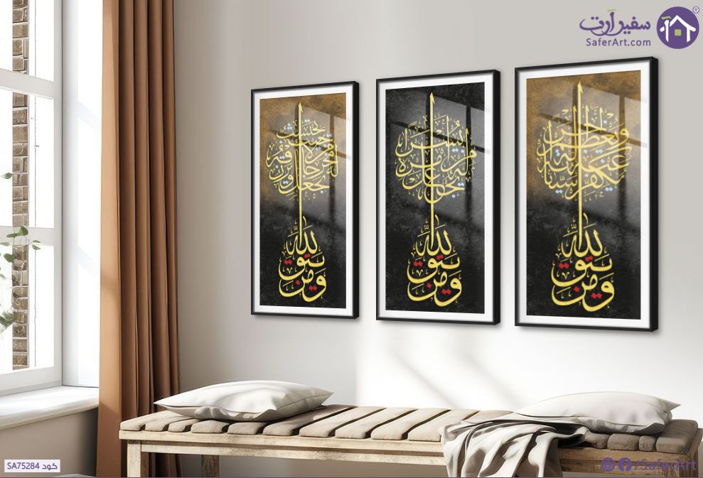 تابلوه مودرن بخط عربى مميز لثلاث قطع و ثلاث ايات قرآنيه تبدأ ب ( ومن يتق الله ) بالوان مابين الاسود و البنى و الذهبى, متوفر بمقاسات متعددة يمكنك اختيار او تغيير المقاس عند الطلب ,بتصميم مميز لـ تابلوهات مودرن, تابلوهات مودرن , لوحات فنية مودرن ايات قرآنية و خط عربى, اسلامى - ايات قرآنية و خط عربى , التابلوه يغلب عليه الالوان اسود, الوان داكنة, بنى - بيج, فضى – ذهبى , و مصمم بالشكل التالى 3 قطع, متعدد القطع ( اى عدد ) , بالطول, اكريليك, ببرواز, برواز SF9, برواز اسود, مستطيل , مناسب لديكور حوائط غرفة الاستقبال, غرفة المعيشة, غرفة النوم, مدخل المنزل, مكاتب – شركات - اعمال , و هو يتميز بالسمات التالية : ديجيتال آرت, قابل للتعديل, كتابات و حروف, مودرن , متوفر الان فى مصر و يأتى جاهز للتركيب مع دليل التركيب و اكسسوارات التركيب اللازمه
