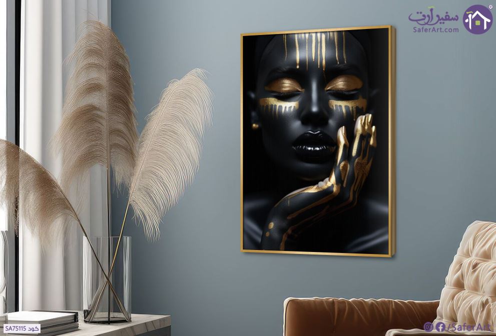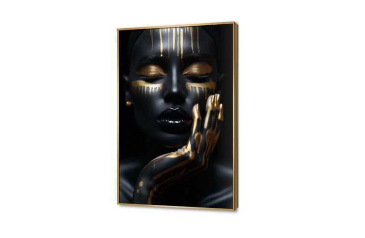 وجه فتاه مغمضة العينين مع روش ذهبية على الوجه و اليد بشكل فنى مميز, متوفر بمقاسات متعددة يمكنك اختيار او تغيير المقاس عند الطلب ,بتصميم مميز لـ تابلوهات مودرن, تابلوهات مودرن , لوحات فنية مودرن افريقى, بنات, شخصيات و وجوه , التابلوه يغلب عليه الالوان اسود, اللون الواحد, الوان داكنة, فضى – ذهبى , و مصمم بالشكل التالى 1 قطعه , بالطول, ببرواز, برواز ذهبى, مستطيل , مناسب لديكور حوائط غرفة المعيشة, مدخل المنزل, مكاتب – شركات - اعمال , و هو يتميز بالسمات التالية : الفن الافريقى, صور فوتوغرافية, مودرن , متوفر الان فى مصر و يأتى جاهز للتركيب مع دليل التركيب و اكسسوارات التركيب اللازمه