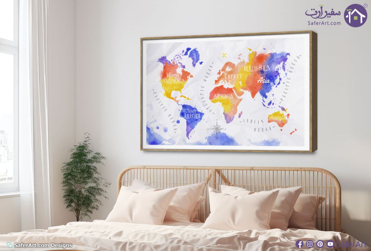 يتميز هذا التصميم الفني بكونه تابلوه مودرن يعرض خريطة العالم باسلوب الرسم المائي الرقمي المبدع حيث تتداخل الالوان الزاهية مثل الازرق والبرتقالي والاصفر لتشكل القارات بلمسة فنية عصرية تضفي حيوية على المكان وتجعل من جدار الغرفة لوحة تنبض بالحياة والثقافة العالمية في اطار انيق ومنظم يناسب مختلف انواع الديكورات المنزلية الحديثة والمكاتب الراقية, متوفر بمقاسات متعددة يمكنك اختيار او تغيير المقاس عند الطلب ,بتصميم مميز لـ تابلوهات مودرن, تابلوهات مودرن , لوحات فنية مودرن اعمال و شركات, خرائط, سياحة و سفر, اماكن و مدن و مباني , التابلوه يغلب عليه الالوان ابيض - اوف وايت, ازرق - تركواز, اصفر, برتقالى , و مصمم بالشكل التالى 1 قطعه , بالعرض, ببرواز, برواز SF9, برواز ذهبى, مستطيل , مناسب لديكور حوائط غرفة الاستقبال, غرفة المعيشة, غرفة شباب, مدخل المنزل, مكاتب – شركات - اعمال , و هو يتميز بالسمات التالية : الوان مائية, ديجيتال آرت, لوحات فنية, مودرن , متوفر الان فى مصر و يأتى جاهز للتركيب مع دليل التركيب و اكسسوارات التركيب اللازمه